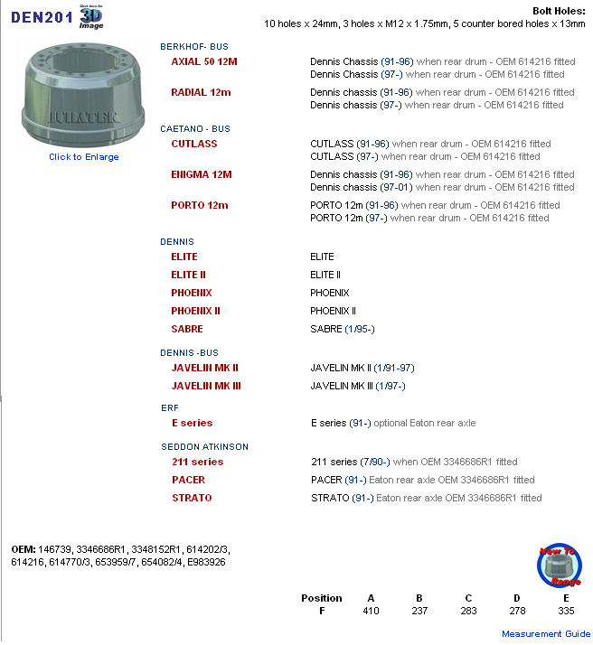 DENNIS: ELITE, PHOENIX, SABRE, JAVELIN rear drum 3346686R1, 146739, 3348152R1, 614202-3, 614216, 614770-3, 653959-7, 654082-4, E983926, ET1522