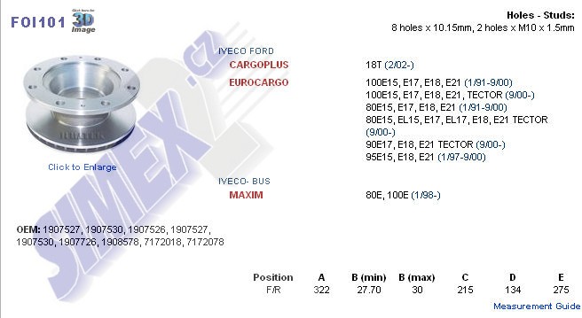 kotouč brzdový IVECO 80-100E15 ,322x215x134x275 PT026.654-00, FOI101, FCR106A, D135, 7172078, 7172018, 1908578, 1907726, 1907530, 1907527, 1907526