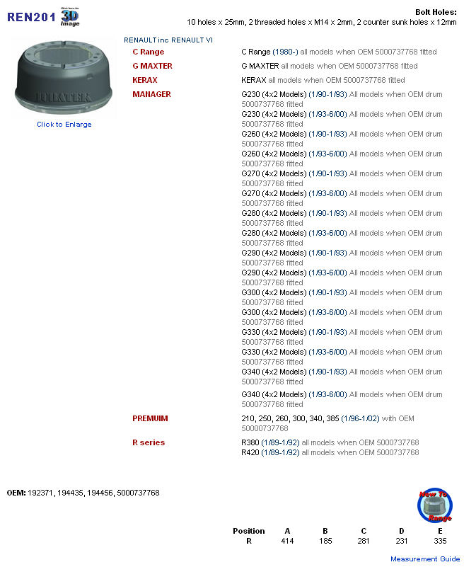 RENAULT: C Range, G Maxter, Kerax, Magnum, Manager, Premium 192371, 194435, 5000737768, 194456, 256.000-00, BL67, BL90, IT 1501R 25207, 156.002-00